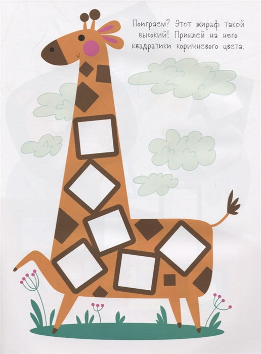 В этой книге 70 наклеек – разноцветных квадратиков. Малыш должен дополнит с их помощью картинки. Это очень просто: покажите ему, что наклейку нужно приклеит в квадратный контур. Если с первой попытки приклеит ровно не получилось – не беда, ведь наши наклейки многоразовые.