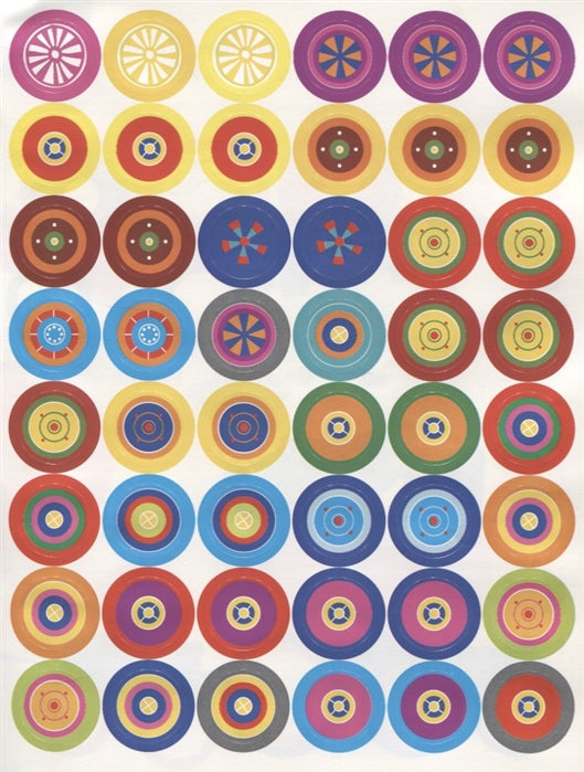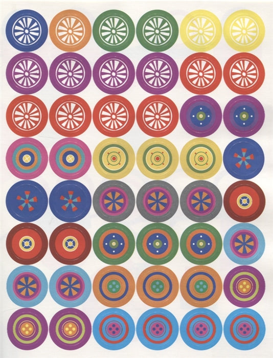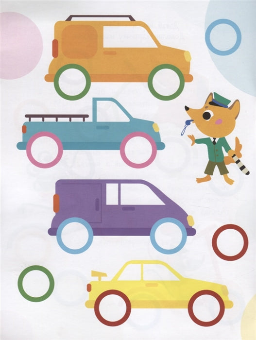 В этой книге 96 наклеек - разноцветных колёсиков. Малыш должен дополнить с их помощью картинки. Это очень просто: покажите ему, что наклейку нужно приклеить в круглый контур. Если с первой попытки приклеить ровно не получилось - не беда, ведь наши наклейки многоразовые.
