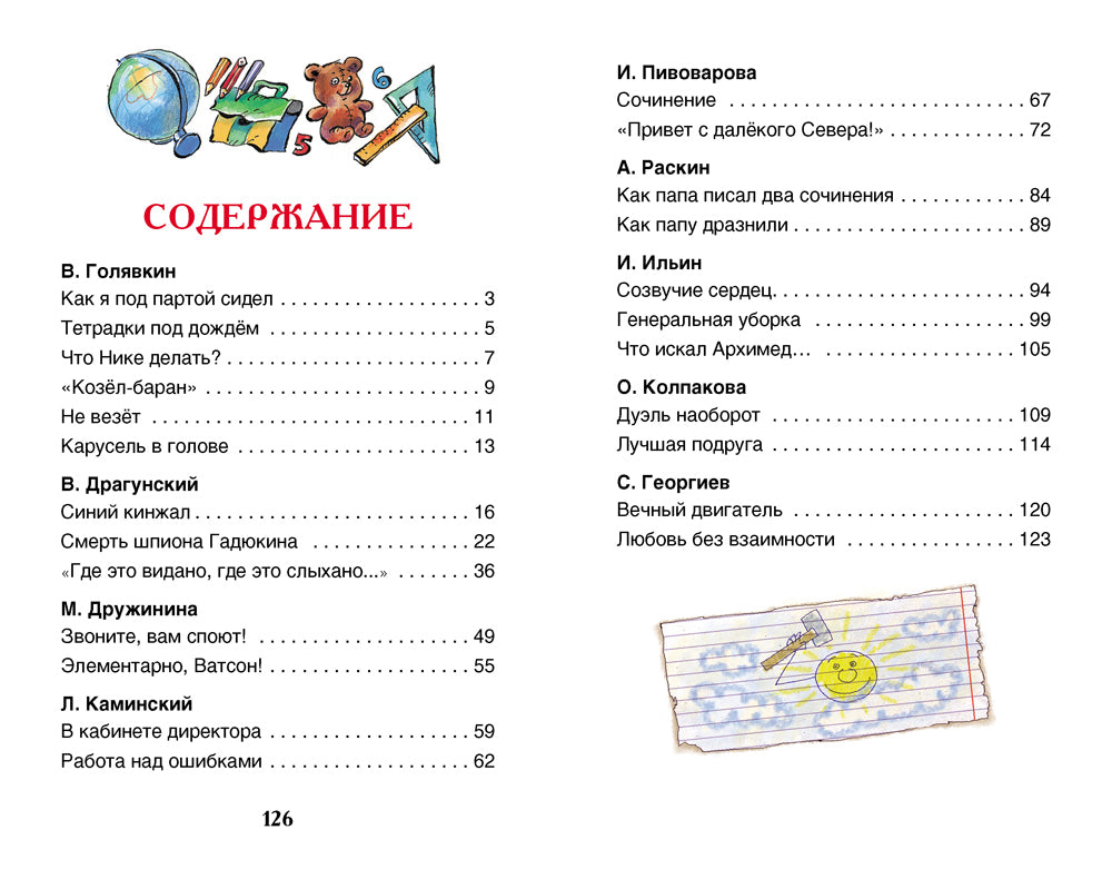 В книгу вошли следующие произведения: В. Голявкин «Как я под партой сидел», «Тетрадки под дождем», «Что Нике делать?», «Козел-баран», «Не везет», «Карусель в голов», В. Драгунский «Синий кинжал», «Смерть шпиона Гадюкина», «Где это видано, где это слыхано», М. Дружинина «Звоните, вам споют!», Л. Каминский «В кабинете директора», «Работа над ошибкам», И. Пивоварова «Сочинение», «Привет с далекого Севера!, А. Раскин «Как папа писал два сочинения», «Как папу дразнили», М. Москвина «Пирамид», И. Ильин «Генеральная уборка», «Что искал Архимед», О. Колпакова «Дуэль наоборот», «Лучшая подруга», С. Георгиев «Любовь без взаимности», «Вечный двигатель».Художники: Е. Кузнецова, А. Халилова, В. Долгов.